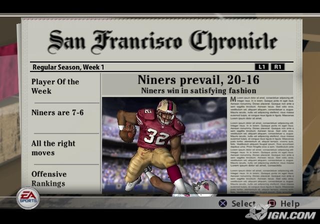 Madden NFL 2005 shipped August 2004. Created at Tiburon and published by Electronic Arts under their EA SPORTS label. I was one of the lead programmers for the console version this year instead of the PC version, in charge of the UI and Franchise modes. The main features that I worked on for this game were: the newspaper, sports radio, and e-mail system. These all help you keep track of what is going on around the league during your franchise. Each story in the newspaper is readable and has links to different things you can do in your franchise. I wrote the logic behind how the newspaper stories appear an dhow they get parsed with text replacement. I also wrote how the 3D model in the interface gets posed into a single frame animation for the picture in the newspaper. The sports radio feature is just like a sports program you hear on the radio. I programmed the code behind how each of the radio segments gets played. I even climbed into the audio booth to record some of the phone calls coming into the radio show.